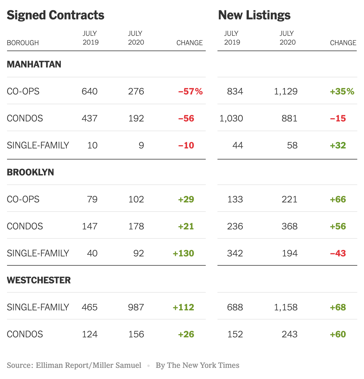 The New York Times created a terrific graphic on our Elliman New Signed Contract Report by illustrating the performance of Manhattan and Brooklyn versus Westchester County. Brooklyn’s sales market performance is closer to Westchester than it is to its city counterpart.