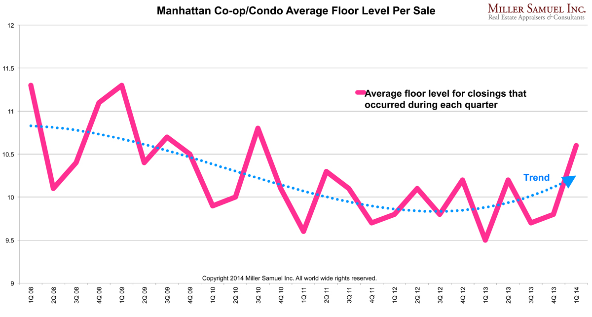 [My post title was originally “Manhattan Rebound Not Because of Dizzying Heights” but wasn’t Curbed staff didn’t think it was catchy enough, ed.]Spectators and participants in the Manhattan housing market have been burning a lot of calories talking about views, something the super luxury new development projects have been marketing as a key feature. I thought I’d look back over time to at what the average floor level of closed co-op and condo sales by quarter, and see if there is a pattern. I sifted through six years of data (note to self for rainy day: go back 25 years and break out condos and co-ops). While I’ve analyzed the value of floor level in Manhattan here and here before, I’ve never trended floor level and didn’t quite know what to expect…