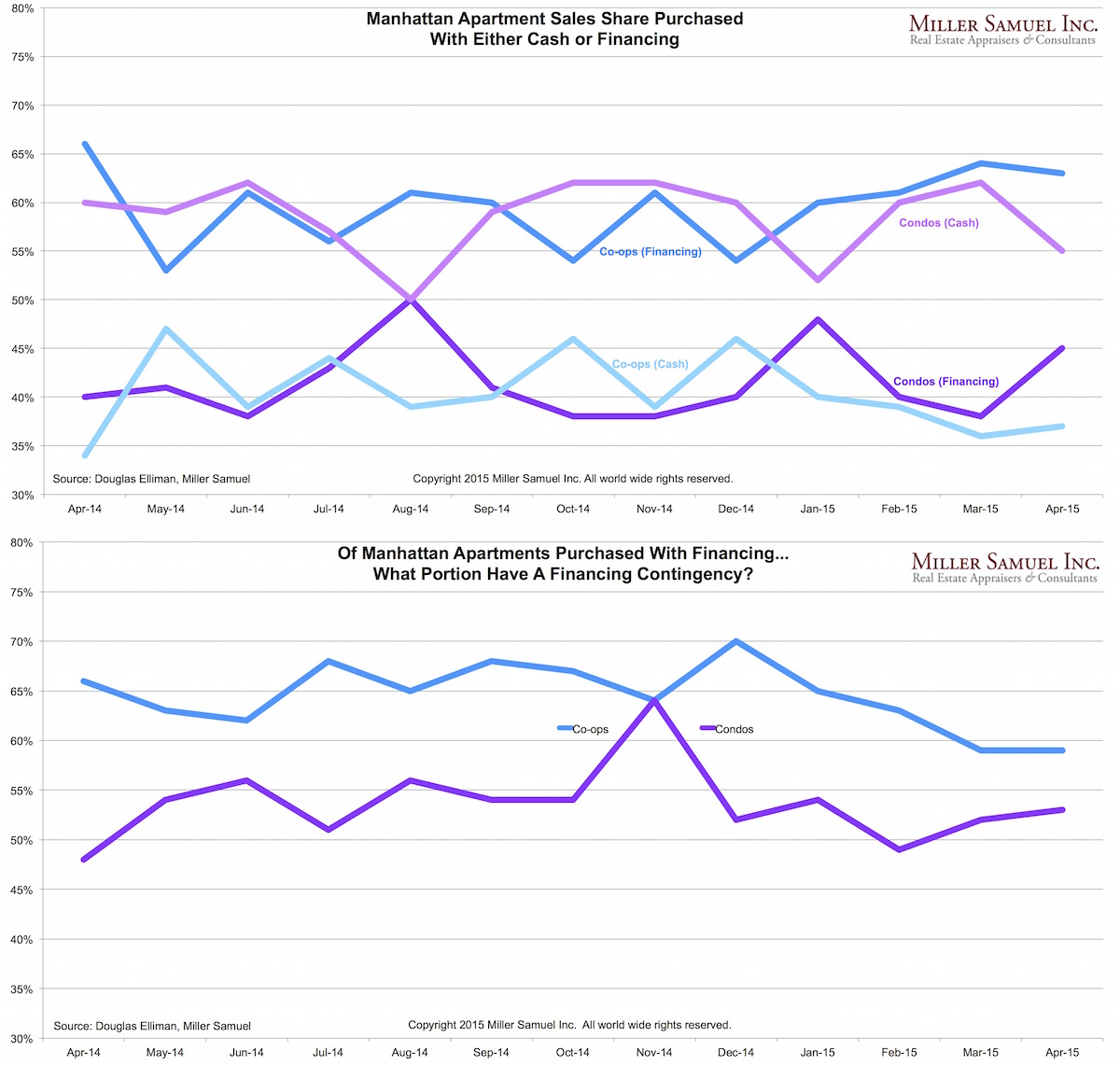[click to expand chart]The Washington Post published an article last year titled “8 in 10 Manhattan home sales are all-cash,” a statement that was (and still is) hyperbole; the actual figure was 45 percent. The data is worth revisiting, though, and I thought it might be a good time to look at the makeup of Manhattan apartment purchases in regards to cash versus financing. Obviously, there has been some confusion in the past, so I thought it would be helpful to display a year’s worth of trend data…
