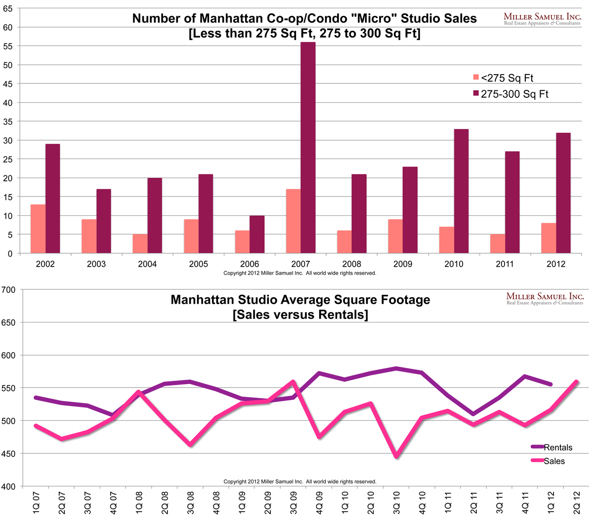 [click to expand]There has been a lot of attention lathered on the mayor’s recent announcement that would allow the creation of smaller studios to improve affordability, so I thought I’d take a look at this sub market for a reality check. Since a “micro unit” was defined as 275-300 square feet, I took a look at how common they were in the sales market over the past decade (I don’t have enough sqft data compiled for small rental studios yet) and I also compared all sale studio sizes against all rental studio sizes over the past five years.