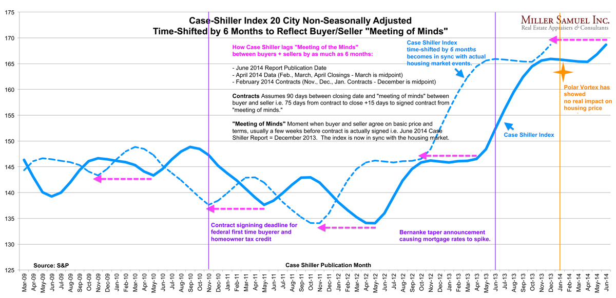 And here’s the same index that I time-shifted backwards by 6 months to reflect the “meeting of the minds” of buyers and sellers. More specific methodology is embedded in the following charts. By moving the index back 6 months, the changes in the direction of the index are in sync with economic events (reality). In my view this index has a 6 month (5-7) month lag rendering it basically worthless to consumers but perhaps a useful tool for academic research where timing may not be as critical. I’m just grasping here.
