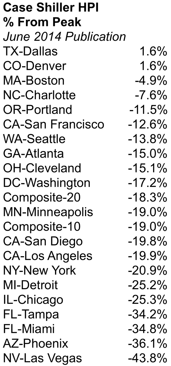 And here is the ranking by year-over-year changes for each city as well as the 10 and 20 city index. Dallas and Denver are no longer under water and Las Vegas, despite recent good news has a long way to go to get to the artificial credit induced high it reached in 2006.