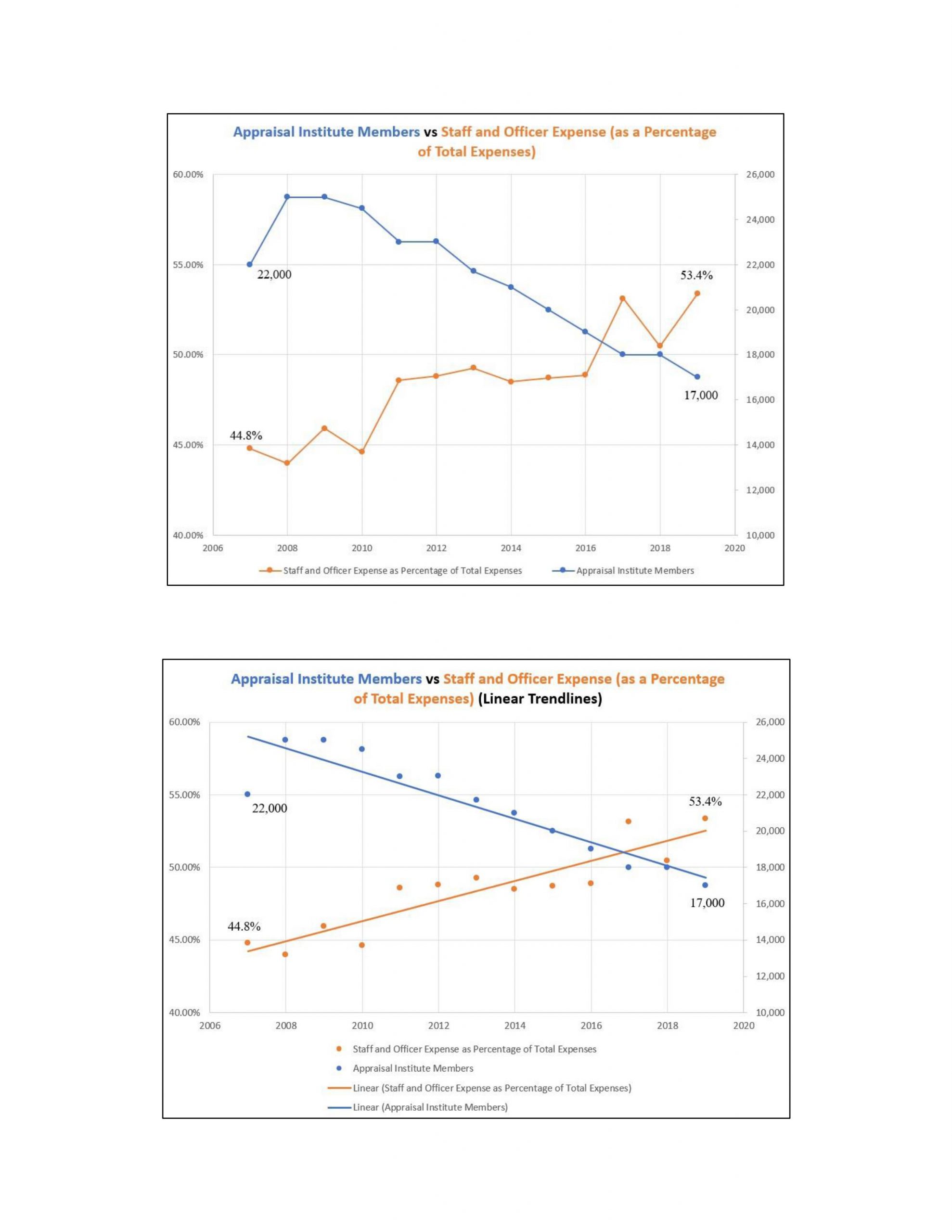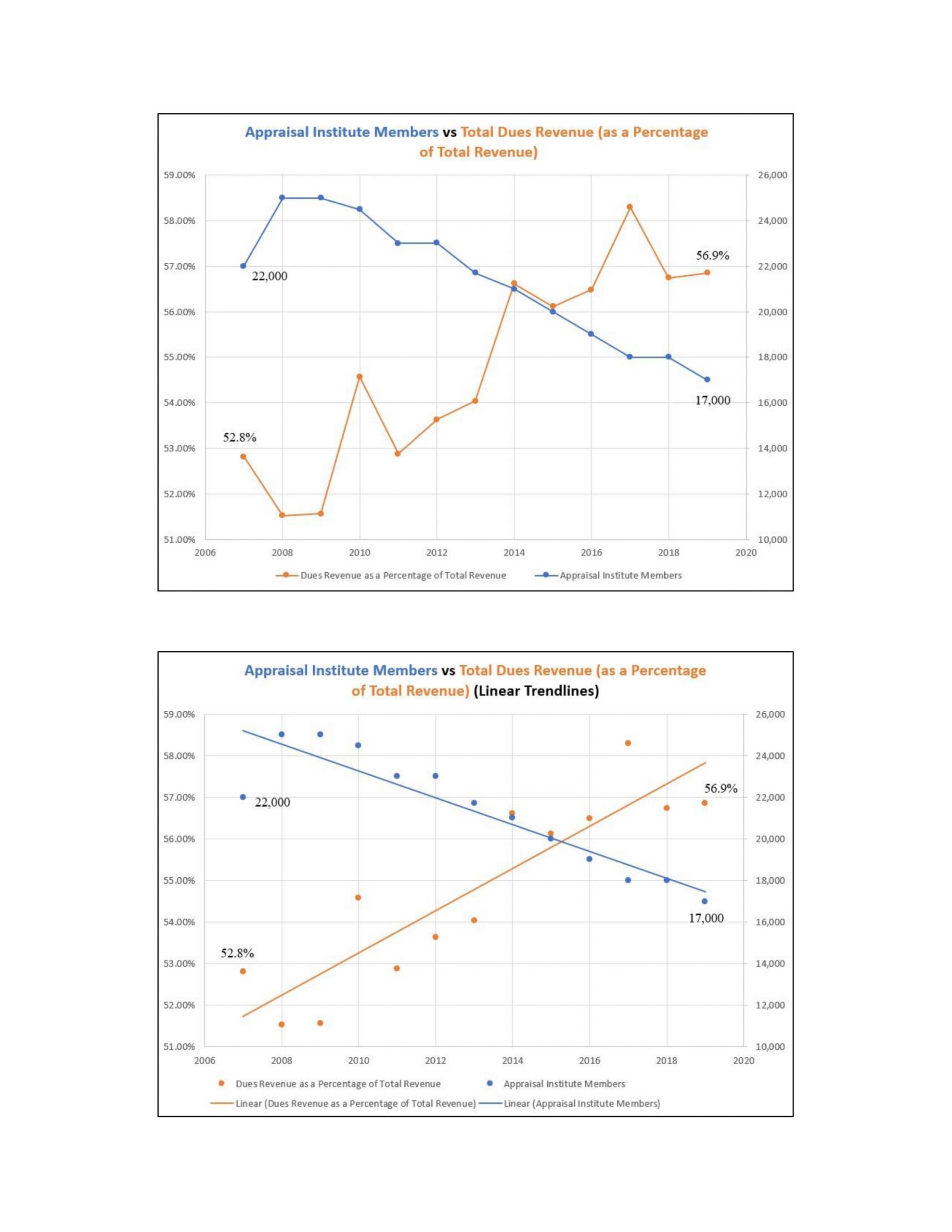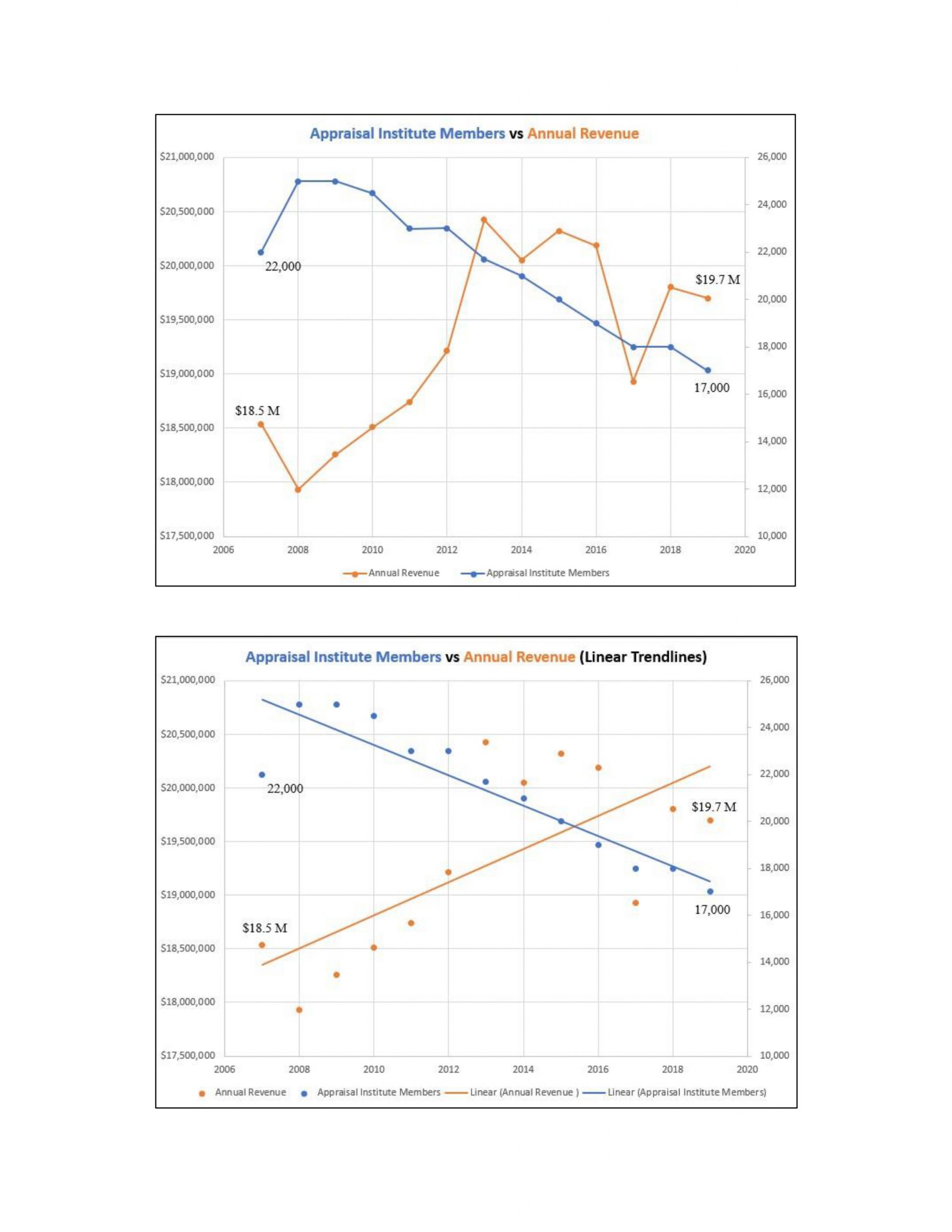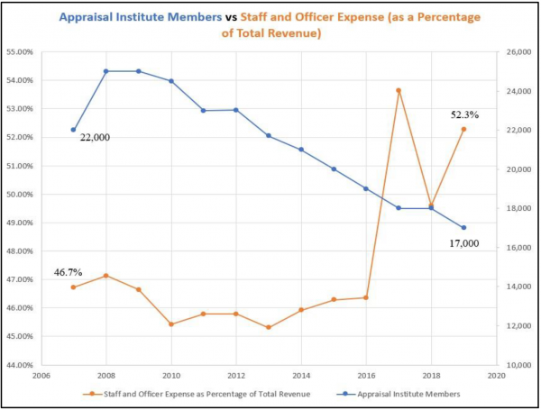 Over the past few days, a detailed analysis of the Appraisal Institute’s performance from 2006-2019 has gone viral within the industry. The anonymous author(s) analyzed AI National’s 990 tax filings in a series of charts and tables by “Concerned Members,” and you can download it here: The Appraisal Institute as Told by the 990s [click on each to expand].