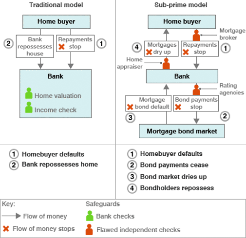 >The US sub-prime mortgage crisis has lead to plunging property prices, a slowdown in the US economy, and billions in losses by banks. It stems from a fundamental change in the way mortgages are funded.