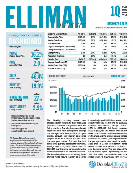 The Brooklyn housing market was characterized by records for the overall sales price trend indicators, heavy sales volume and falling inventory. Overall prices were skewed higher by more new development closings that averaged twice the size of the prior year quarter. Borough wide median sales price jumped 16.2% to a record $770,000 from the prior year quarter. This was the third consecutive quarterly record set for this metric. Average sales price jumped 25% to a record $993,955 over the same period, and was the second record set in the past three quarters…