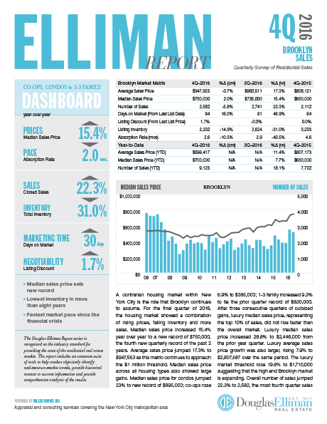 A contrarian housing market within New York City is the role that Brooklyn continues to assume. For the final quarter of 2016, the housing market showed a combination of rising prices, falling inventory and more sales. Median sales price increased 15.4% year over year to a new record of $750,000, the fourth new quarterly record of the past 2 years. Average sales price jumped 17.3% to $947,553 as this metric continues to approach the $1 million threshold…