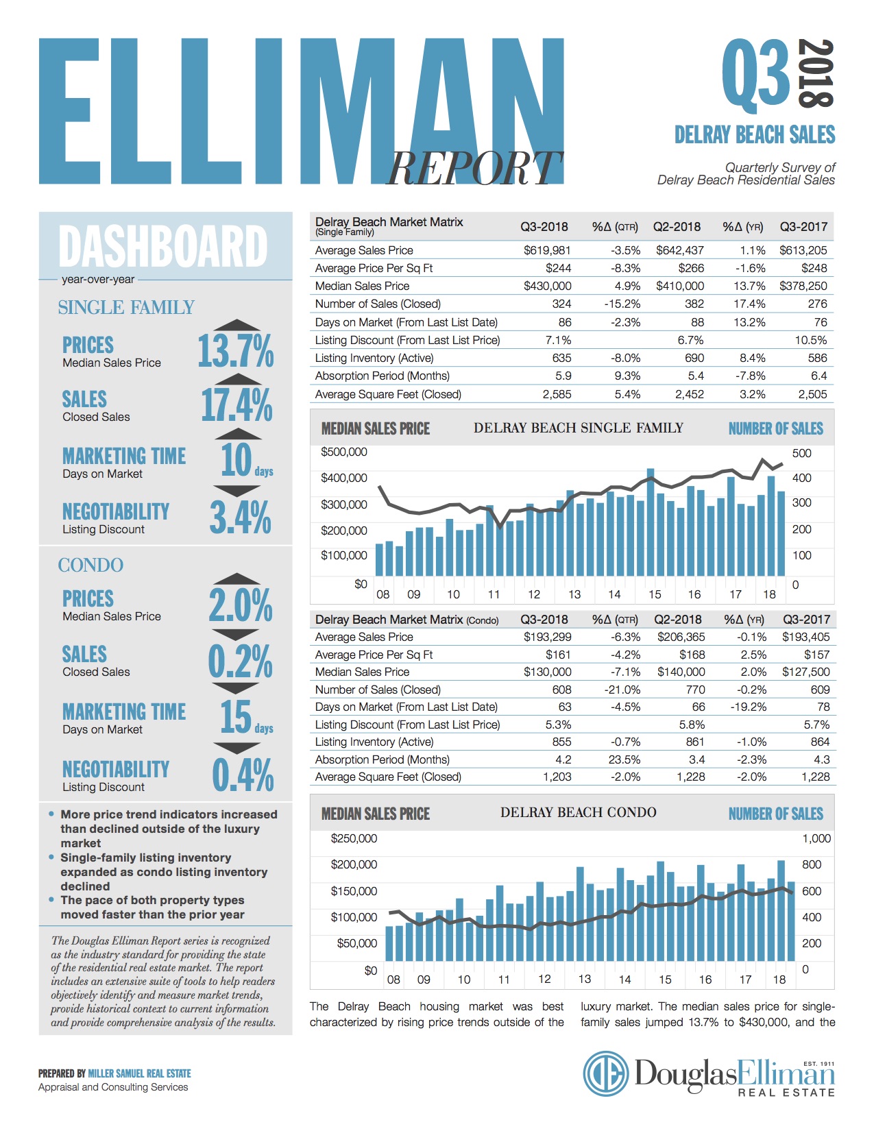 The Delray Beach housing market was best characterized by rising price trends outside of the luxury market. The median sales price for singlefamily sales jumped 13.7% to $430,000, and the median sales price for condos increased 2% to $130,000 respectively from the year-ago quarter. The trends shown with the remaining price indicators of the average sales price and the average price per square foot showed mixed results across the singlefamily and condo markets. The price trend results of the luxury market, representing the top 10% of all sales, showed weaker trends but were skewed…