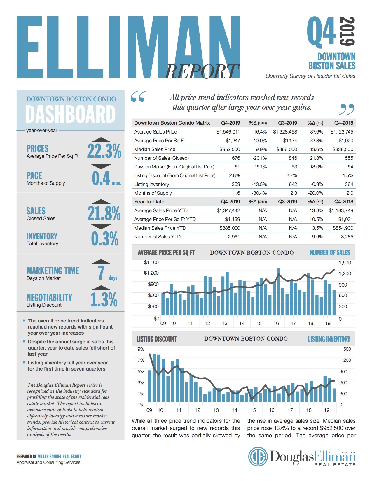 While all three price trend indicators for the overall market surged to new records this quarter, the result was partially skewed by the rise in average sales size. Median sales price rose 13.6% to a record $952,500 over the same period. The average price per square foot increased by 22.3% to $1,247, and average sales price surged 37.6% to $1,546,011, respectively, from the year-ago quarter to new records as well. After four…