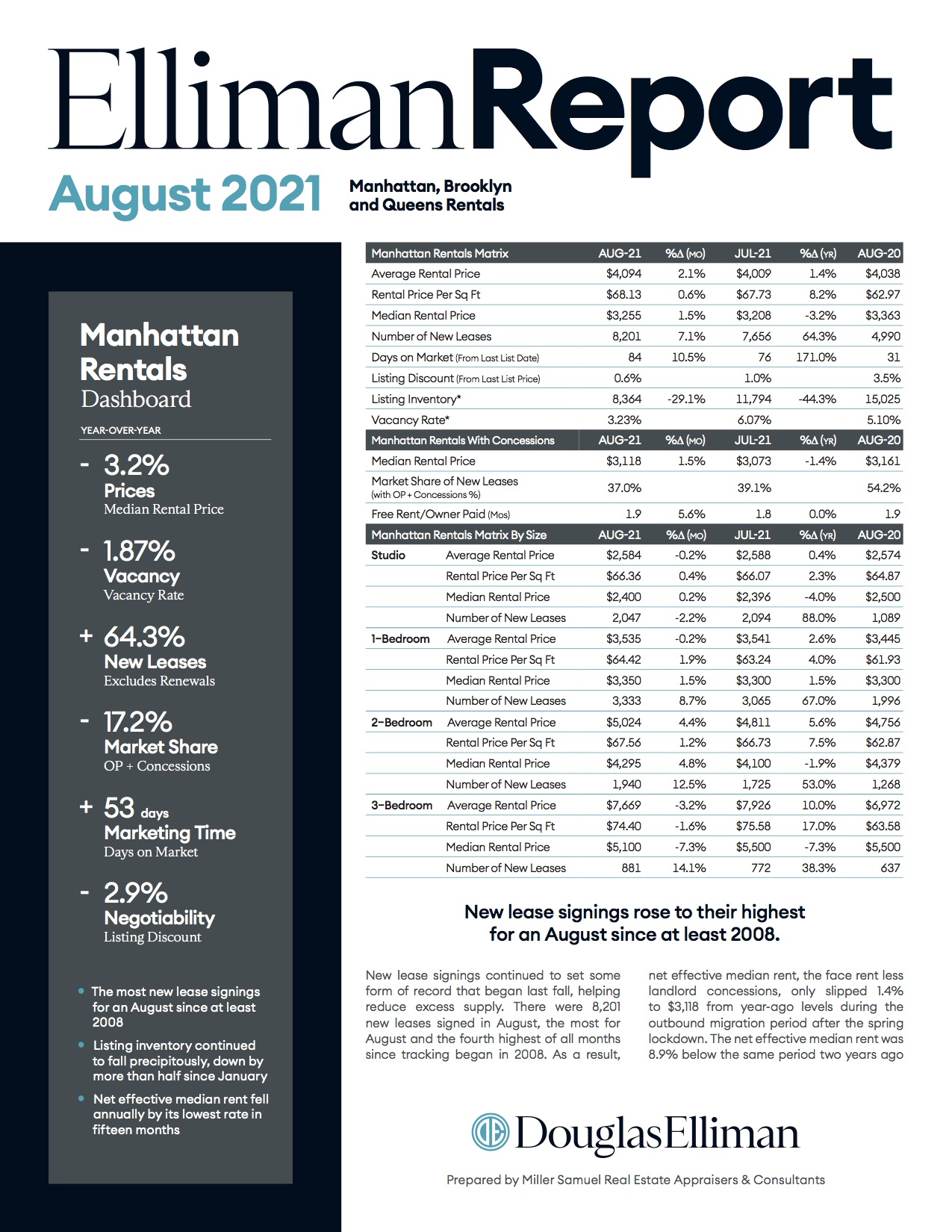 MANHATTAN New lease signings continued to set some form of record that began last fall, helping reduce excess supply. There were 8,201 new leases signed in August, the most for August and the fourth highest of all months since tracking began in 2008. As a result…