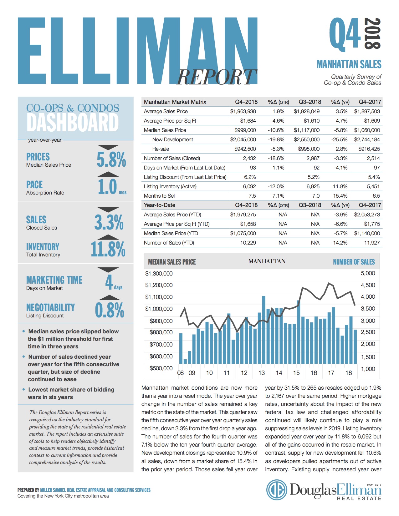 Manhattan market conditions are now more than a year into a reset mode. The year over year change in the number of sales remained a key metric on the state of the market. This quarter saw the fifth consecutive year over year quarterly sales decline, down 3.3% from the first drop a year ago. The number of sales for the fourth quarter was 7.1% below the ten-year fourth quarter average. New development closings represented 10.9% of…